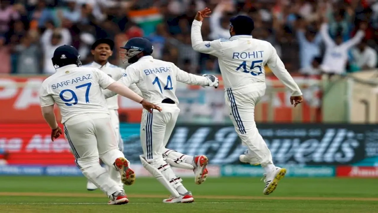 Cricket - Second Test - India v England - Dr. Y.S. Rajasekhara Reddy ACA-VDCA Cricket Stadium, Visakhapatnam, India - February 5, 2024 India's Rohit Sharma celebrates with Srikar Bharat and Sarfaraz Khan after taking the catch to dismiss England's Ollie Pope, off the bowling of Ravichandran Ashwin REUTERS/Francis Mascarenhas