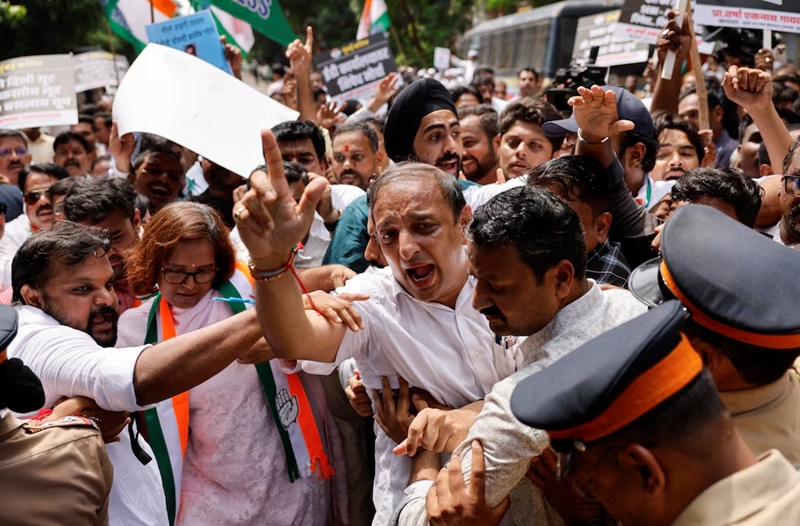 Congress supporters clash with police as they attempt to go past a barricade to reach the Enforcement Directorate (ED) office, on a street in Mumbai, India, August 22, 2024. The protest is against SEBI chief Madhabi Puri Buch and her husband Dhaval Buch and a demand for a probe into the Adani group after their names were mentioned in the Hindenburg research in its latest report. REUTERS/Francis