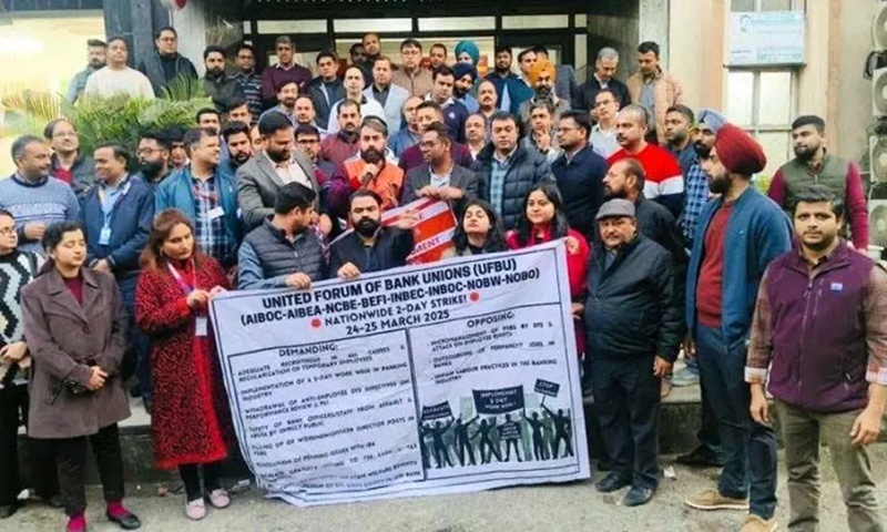 Bank employees staging protest for introduction of a 5-day work week in banking industry in Jammu on Feb 21, 2025. (File Photo)