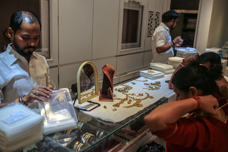 A customer looks at a gold necklace at the Umedmal Tilokchand (U.T) Zaveri jewelry store at Zaveri Bazaar in Mumbai, India. (Photo: PTI)