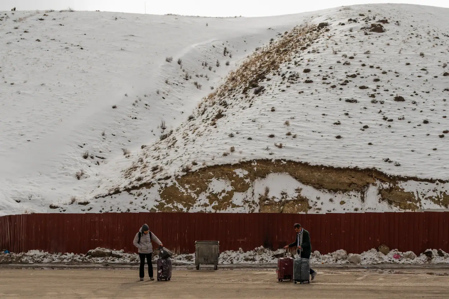 • People, mostly Iranians who crossed from Iran at the Kapikoy border crossing, pull luggage in Turkey’s eastern Van province, Friday, March 6, 2026. (AP Photo/Murat Kocabas)