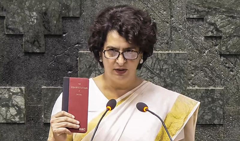 The 52-year-old, who joins her mother Sonia and brother Rahul as an MP in what is a rare instance of three members of a family together in Parliament, took affirmation in Hindi while holding a copy of the Constitution soon after the House met.