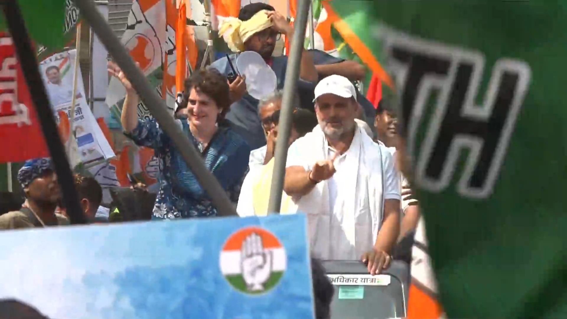 Vadra and Gandhi, along with Telangana Chief Minister Revanth Reddy, RJD leader Tejashwi Yadav and other representatives of the INDIA bloc, were seen sitting on the roof of an SUV, which was moving slowly, as they waved at an enthusiastic crowd.