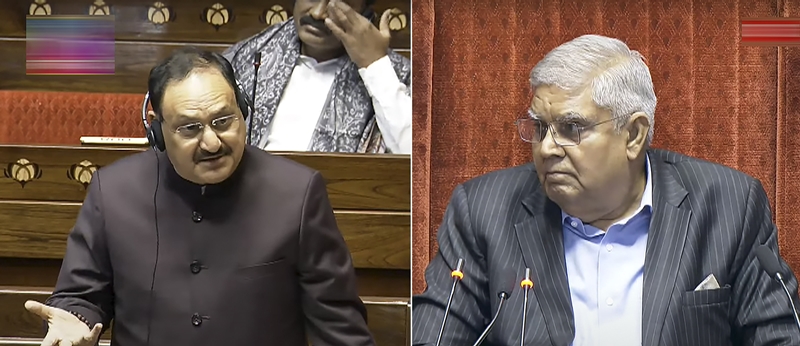 Rajya Sabha Chairman Jagdeep Dhankhar conducts proceedings as Union Minister JP Nadda speaks in the House during the Winter session of Parliament. (Photo: PTI)