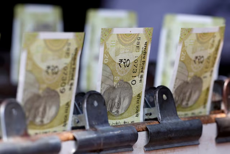 Indian twenty rupee currency notes are displayed at a roadside currency exchange stall in New Delhi, India, May 24, 2024. REUTERS/Priyanshu Singh