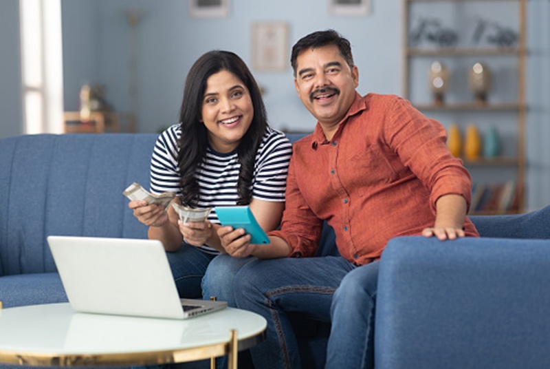 An Indina couple budget counting sitting on sofa at home. (Photo: Getty Image)