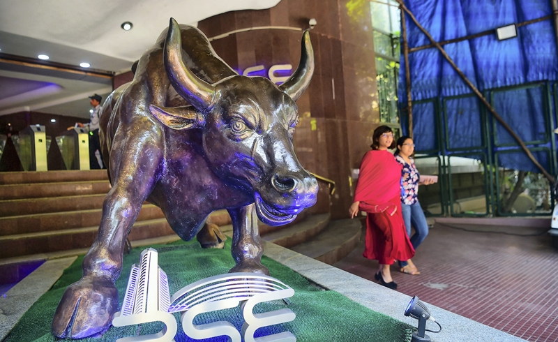 Women walk past a bronze bull statue at the entrance to the Bombay Stock Exchange (BSE) building in Mumbai India. (Photo: PTI)