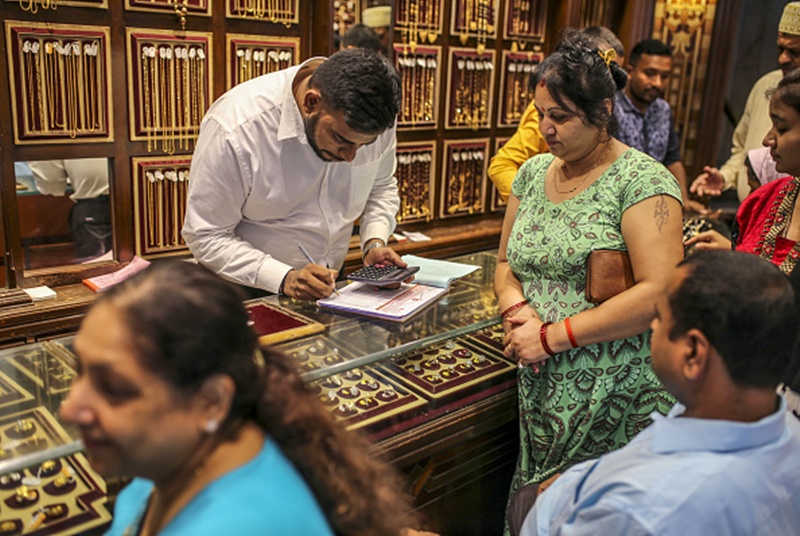 Customers browse gold jewelry as an employee writes on a counter inside the Zaveri Kapoorchand Lalchand jewelry store in the Zaveri Bazaar in Mumbai, India. (Photo: Getty Image)