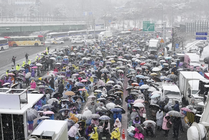 Some protesters had gathered overnight in downtown Seoul, where temperatures fell below minus 5 degrees Celsius (23 degrees Fahrenheit). More than 6 cm (2.4 inches) of snow has piled up in some areas, prompting a warning.
