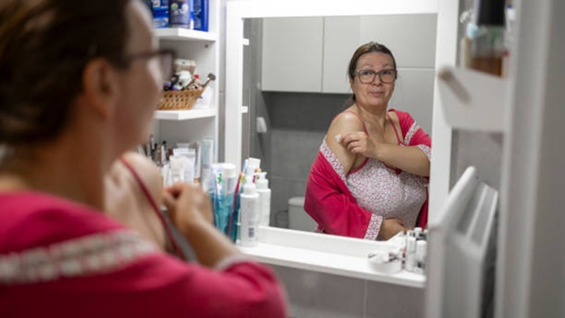 A beautiful mature woman applies transdermal patch as hormonal therapy in menopause. (Photo: Getty Image)