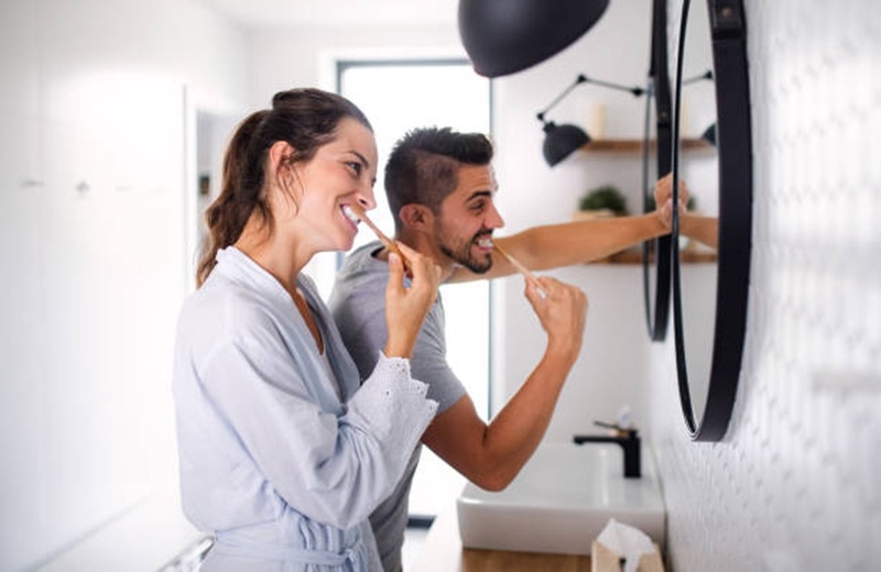 Portrait of young couple standing indoors in bathroom at home, brushing teeth. (Photo: Getty Image)