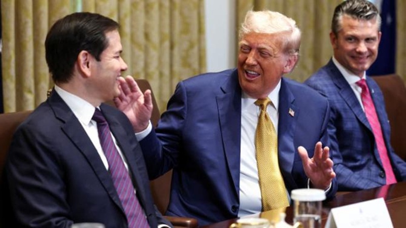 US President Donald Trump speaks with Secretary of State Marco Rubio, as Defence Secretary Pete Hegseth smiles in the background, during a cabinet meeting at the White House in Washington, DC, on July 8, 2025. (Photo: Reuters)