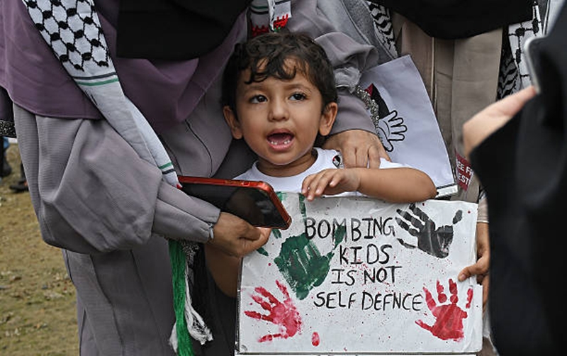 A young boy holds a placard with words 'Bombing kids is not self defence' during the Palestine solidarity gathering in Mumbai on Aug 20, 2025. (Photo: Getty Image)