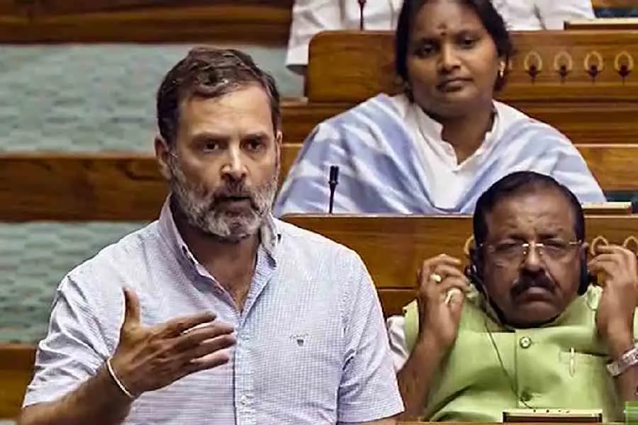 Congress MP Rahul Gandhi speaks in the Lok Sabha during the special session of the Parliament on Wednesday, in New Delhi.(Photo/ PTI)